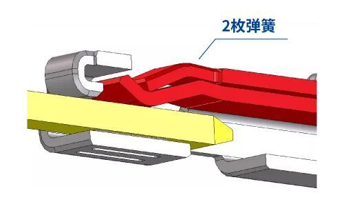 公端子采用2枚彈簧的結(jié)構(gòu)。這比單片彈簧的接觸力高,有抑制來自外部振動影響的效果。