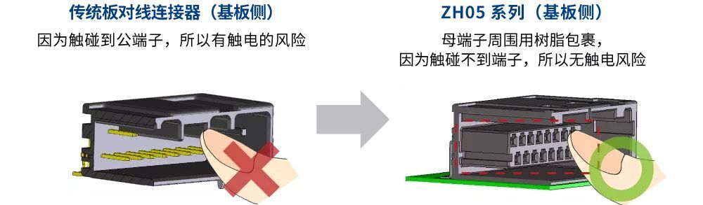 隨著電池生產(chǎn)數(shù)量的增加對安全性的要求 一般監(jiān)控車載電池電壓等連接到帶電部位時,使用棒狀突出的公端子作為基板端的連接器。但是,現(xiàn)有的連接器端子形狀會產(chǎn)生異物附在相鄰端子之間,從而產(chǎn)生短路的風(fēng)險。而且工作人員在進(jìn)行插拔作業(yè)時接觸到端子會有觸電的風(fēng)險。在世界范圍內(nèi),隨著向混合動力車和EV(電動汽車)轉(zhuǎn)移的趨勢,電池的生產(chǎn)數(shù)量不斷增加,這也意味著風(fēng)險的增加,那么安全對策就成為了當(dāng)務(wù)之急。 創(chuàng)造性的結(jié)構(gòu),確保高安全性 為了滿足這樣的需求,“ZH05”在追求車載品質(zhì)和防止觸電這兩點(diǎn)上進(jìn)行了開發(fā)。板對線連接器采用箱型的公端子,用樹脂將端子周圍物理性包圍使之絕緣,并實(shí)現(xiàn)了即便有異物進(jìn)入也不會造成短路,工作人員不會觸摸到端子的革新化的防觸電結(jié)構(gòu)。另外,采用了公端子獨(dú)有的雙彈簧結(jié)構(gòu),確保了適合車載內(nèi)部連接使用的耐熱性及耐振動性,從而完成了高可靠性的連接器。并且,由于在電池方面,電池的容量很重要,所以也追求其小型化,這就是“ZH05”。 防觸電車載用板對線連接器“ZH05” (1) 基板端連接器的公端子周圍用樹脂包圍的防觸電構(gòu)造。
