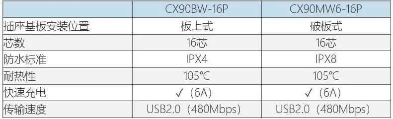 “CX90MW6-16P”是將連接器嵌入基板安裝的破板式類型,由于沒有安裝高度,有助于設(shè)備的低薄化。此外,通過在內(nèi)部使用獨(dú)特結(jié)構(gòu)的零件實(shí)現(xiàn)了高基板固定強(qiáng)度,結(jié)合外殼所具備的螺絲孔,在安裝后進(jìn)行螺絲固定,可以進(jìn)一步提高固定強(qiáng)度。作為對環(huán)境的特性,實(shí)現(xiàn)了IPX8的高防水性能?!癈X90BW-16P”和“CX90MW6-16P”都具有105℃的高耐熱性,并且還支持6A高電流的高速充電。